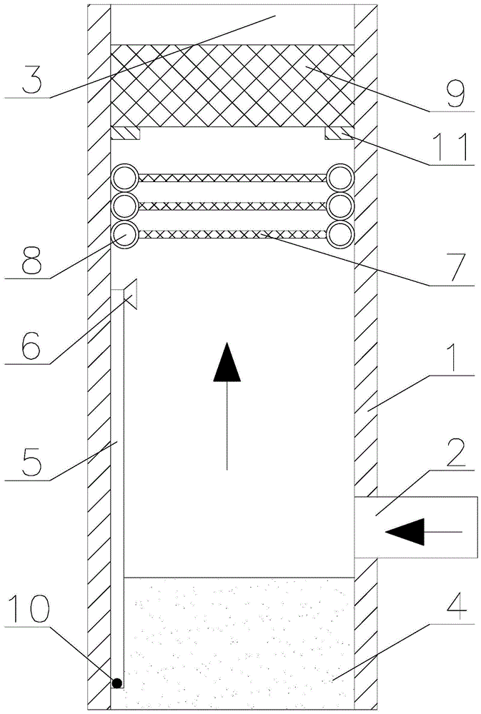 圖中:1、噴淋塔,2、進(jìn)氣通道,3、出氣口,4、儲(chǔ)水槽,5、水管,6、噴霧頭,7、除霧絲網(wǎng),8、冷凝管,9、炭箱,9-1、紗布,10、鐵球,11、限位塊。